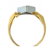 Δαχτυλίδι κίτρινος χρυσός Κ18 σε συνδυασμό με λευκόχρυσο. Τετράγωνο σχέδιο με άχρωμα μικρά διαμαντάκια και καρδούλες εκατέρωθεν στη βάση
